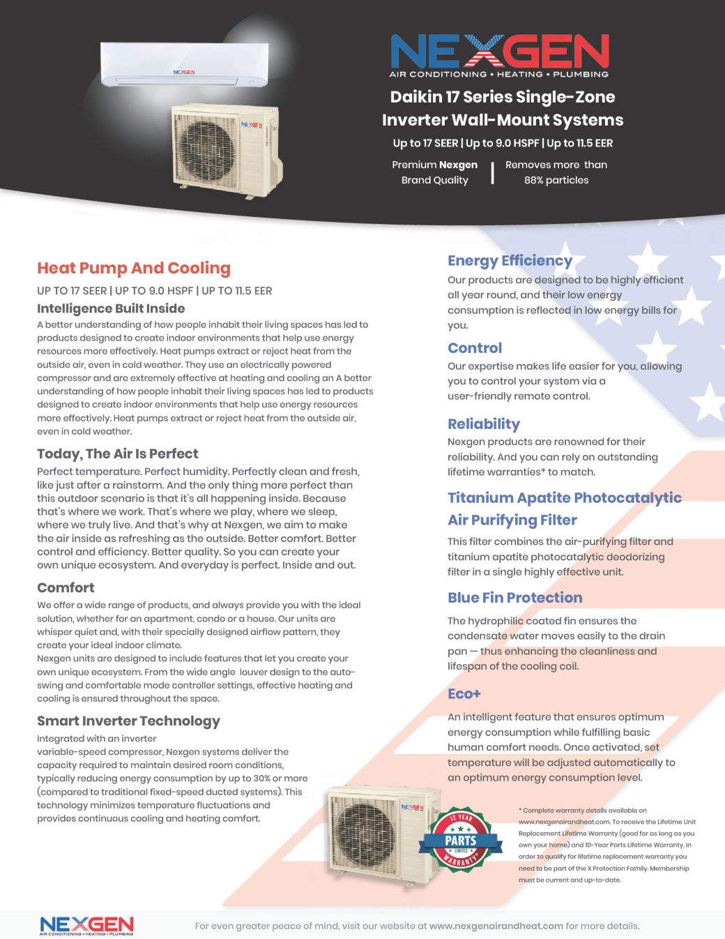 The 17 Series represents the reliability, performance levels, efficiency, and ease of use of the NEXGEN product line. It is operated by a user-friendly remote control, which includes a POWERFUL button to boost heating or cooling power for 20 minutes even at high capacity. A compact, streamlined, wall-mounted design simplifies installation and ensures the ductless heat pump remains out of the way yet highly dependable and efficient.
