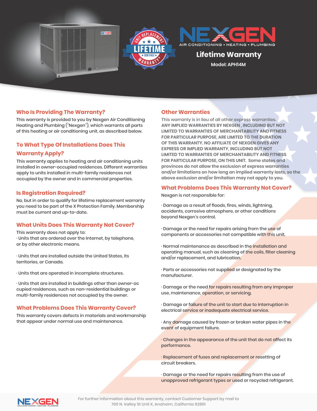 This HERS tested rooftop heat pump delivers a highly efficient cooling capacity and meets 14 SEER and 8.0 HSPF efficiency levels. The APH14M matches the reliability and performance of the NEXGEN brand. Since the blower compartment is fully insulated, the unit operates quietly. It’s built into a self-contained package unit, whether installed on the ground or on the roof. Fewer moving parts mean reduced energy use, which includes the high-efficiency scroll compressor built into this heat pump.