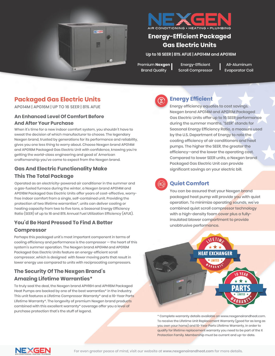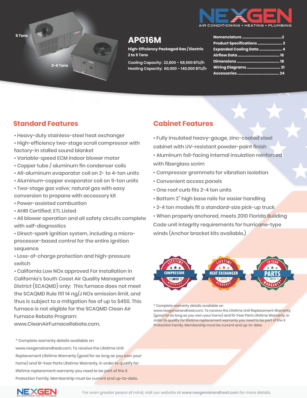 Efficient cooling capacity (with ratings of up to 16 SEER and 81% AFUE) is enabled by the APG16M’s refrigeration-grade premium copper tubing, aluminum fin condenser coils, and R-410A refrigerant. The primary heat exchanger is made of stainless steel and uses wrinkle-bend technology, which maximizes durability and reliability. All components are contained within a galvanized steel enclosure, which is protected from extreme outdoor conditions by a powder-paint finish.