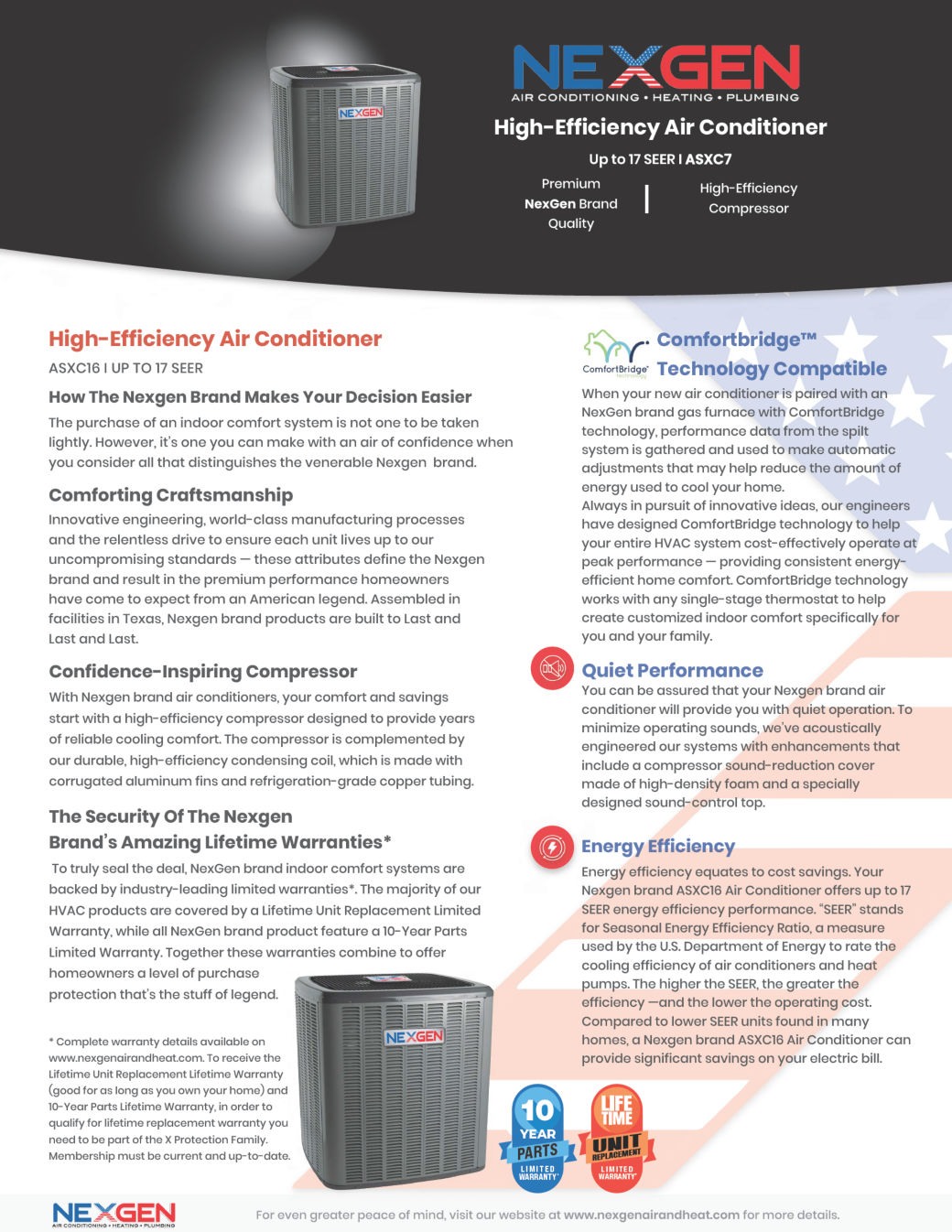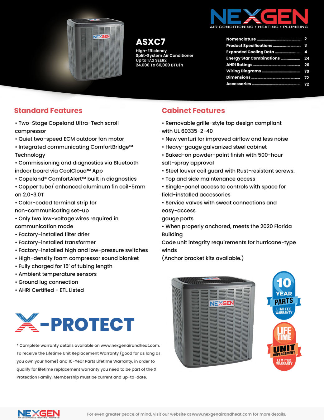A galvanized steel enclosure; 5-millimeter, refrigeration-grade copper tubing; and an aluminum fin condenser coil improve durability, while a factory-installed inline filter drier helps extend service life. The system is compatible with Nest home automation products for smartphone control. Like NEXGEN's traditional HVAC units and other products, it is covered by a Lifetime Unit Replacement Warranty and 10-Year Parts Lifetime Warranty for members of our X Protection Family.